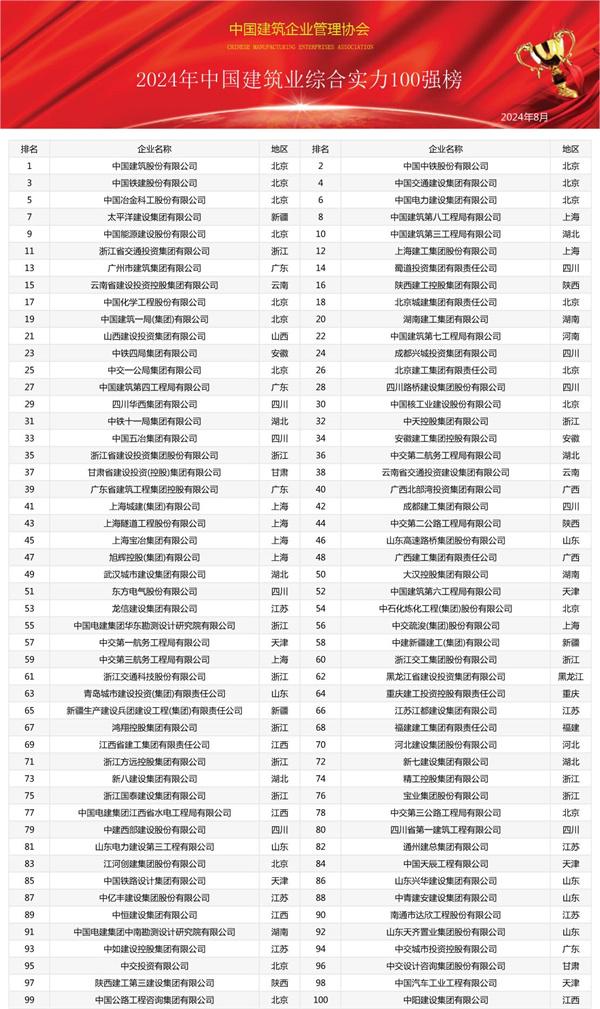 2024年中國建筑業(yè)綜合實(shí)力100強榜震撼發(fā)布,共筑行業(yè)新輝煌